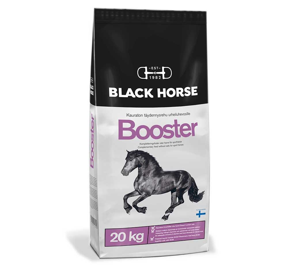 Black Horse Booster är ett kompletteringsfoder speciellt för sporthästar. Med Black Horse Booster kompletteras utfodringen som grundar sig på havre. Black Horse Booster har tillretts omsorgsfullt och innehåller noggrant valda råämnen, vilket garanterar både god smältbarhet och utmärkt smak. Tack vare sin väl balanserade sammansättning passar Black Horse Booster utmärkt som foder för sporthästar tillsammans med havre i förhållandet 50:50, mineraltillsats behövs inte. Ett mångsidigt tillskott av vitaminer och spårämnen garanterar ett tillräckligt intag av dessa även under krävande förhållanden. Spårämnen (Se, Fe, Mn, Zn och Cu) har också tillsatts i form av mycket användbara kelater och fumarater. Black Horse Booster passar för hästar som inte tål havre, doseringen beror på den övriga utfodringen och belastiningen.