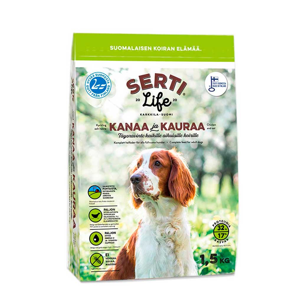 SertiLife Kyckling och Havre helfoder för hundar är rik på finskt fjäderfäprotein av hög kvalitet samt med mycket smältbara och mångsidiga animaliska och vegetabiliska fetter. Den enda spannmålet är havre från Finland. Havre är av naturen glutenfri och är idealisk för att användas i hundfoder. Tack vare den högkvalitativa råmaterialbasen innehåller den också omega-6 och omega-3-fettsyror för att stödja hudens, pälsens och ledernas välbefinnande. Mineraler, vitaminer och spårämnen av hög kvalitet förhindrar brister även under kraftig ansträngning.